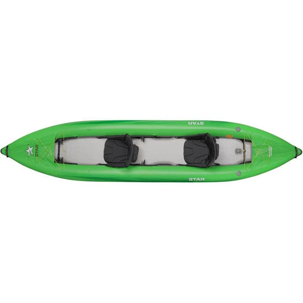 The NRS STAR Paragon Tandem Inflatable Kayak is ready for flatwater day trips and expeditions. With a rigid keel in both the bow and the stern, a removable skeg, and a narrow profile, the Paragon Tandem offers tracking that is comparable to that of a rigid boat. The PVC drop-stitch floor can be inflated to 8-10 PSI which offers paddlers a stable platform that sits above the water. The seats offer plenty of support and is easily unclipped from the D-Rings to make storage and transport even easier. A bow and stern splash cover protects gear, while the bungee systems make tying down additional accessories a breeze.